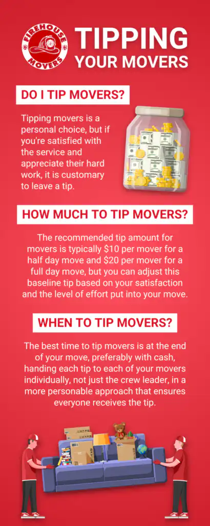 Here’s where people get nervous: What if I want to tip my movers but money is tight? Remember, tipping your movers is a personal choice. Even a smaller amount (like $10 per mover for a short, easy move) is still appreciated.