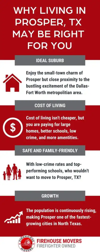 As mentioned above, Prosper is a good place to live because of how close it is to Dallas and the community that it offers its residents. Prosper prides itself on being a safe community for its residents, and one that is ripe for forming connections or growing a family. One of the main drawing points for moving to Prosper, TX is the fact that it has an extremely low crime rate, making it an ideal suburb for families with small children and those that want to enjoy their life without thinking about how safe they are at all times. Further, the town has an excellent education system to pair with the community to make it an ideal place to raise children. Lastly, the small-town charm that Prosper gives its residents could be an important factor in their decision to call this suburb home.